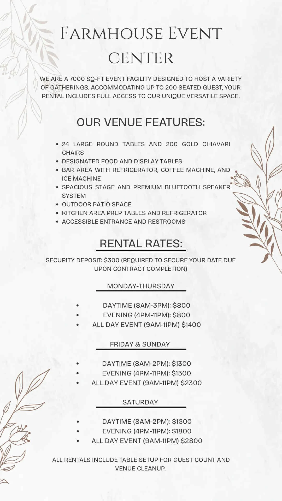 Farmhouse Event Center is the perfect place for any event. Please see the attached pricing information and let us know if you are interested in booking an event with us. You can use the link below to send us a message via Facebook or you can call (734) 984-4440.