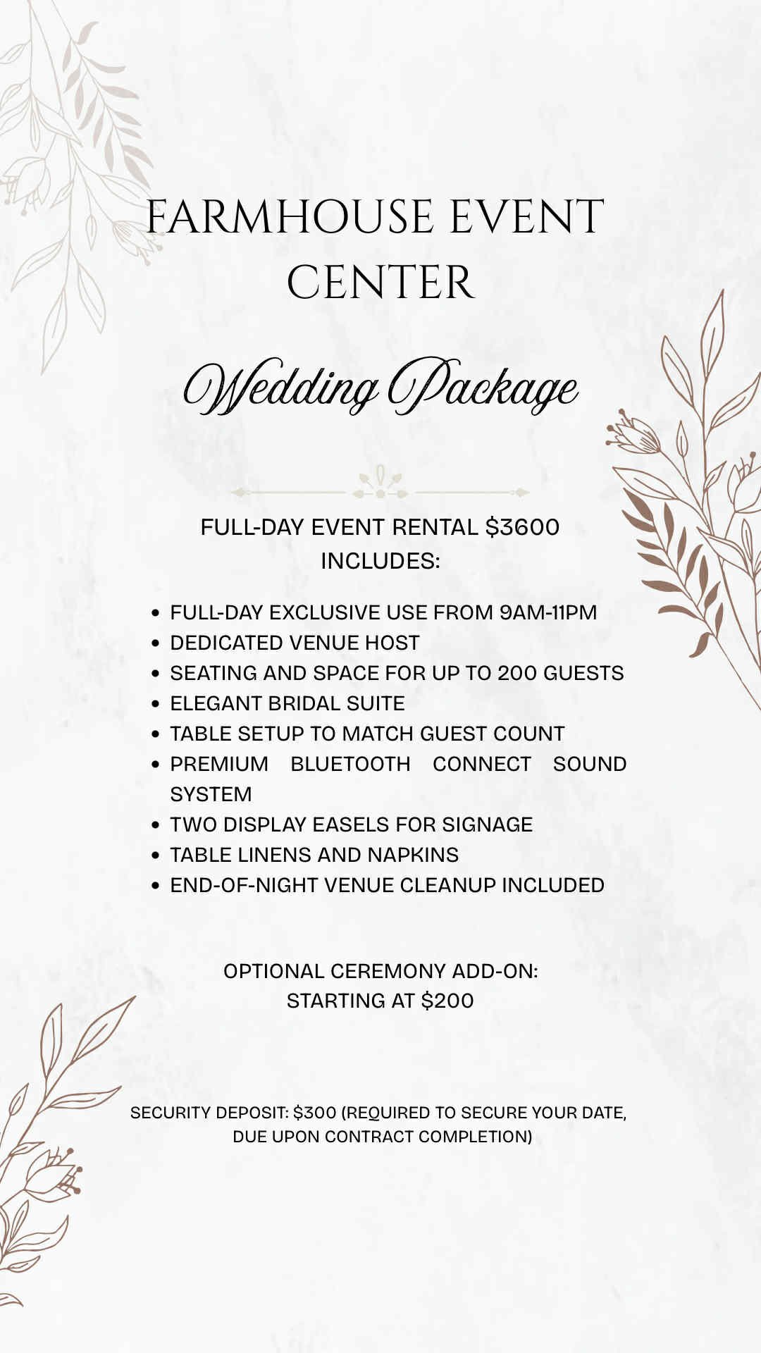 The Farmhouse Wedding: Our stunning Farmhouse Event Center is the perfect place to have a wedding. This space was redesigned to create the perfect space for your wedding reception and there is also an outdoor space perfect for a quaint outdoor wedding as well.